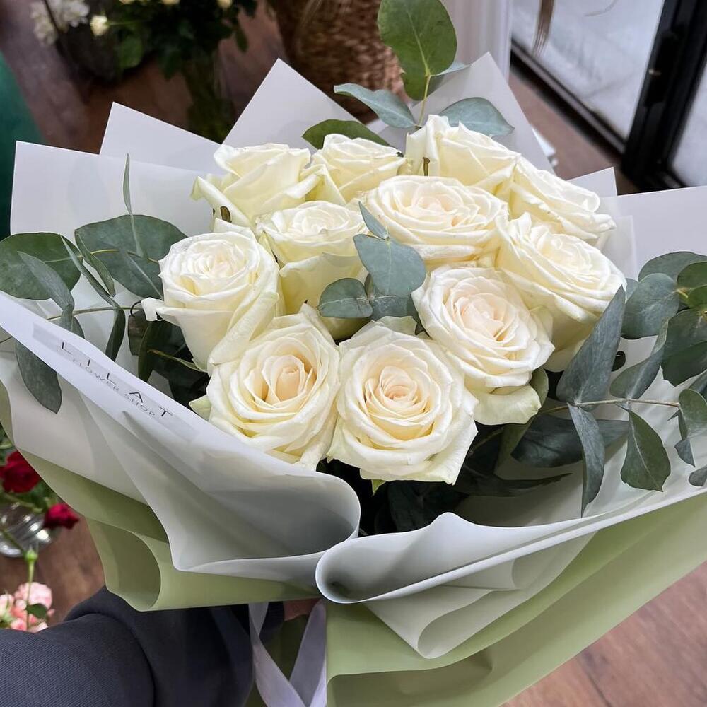 Eucalyptus – 5 шт. White rose – 11 шт. packaging design – 3 шт. gift message card – 1 шт. care instruction – 1 шт.