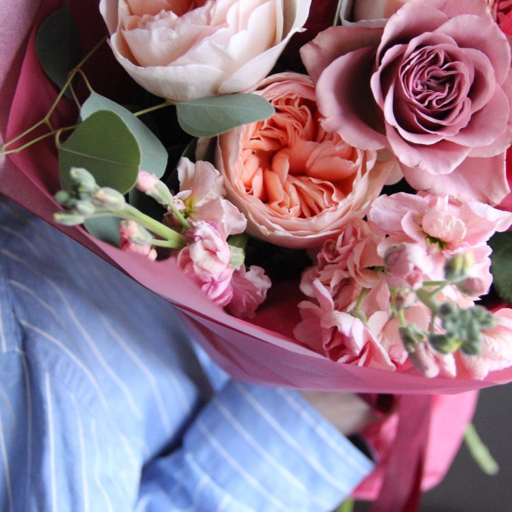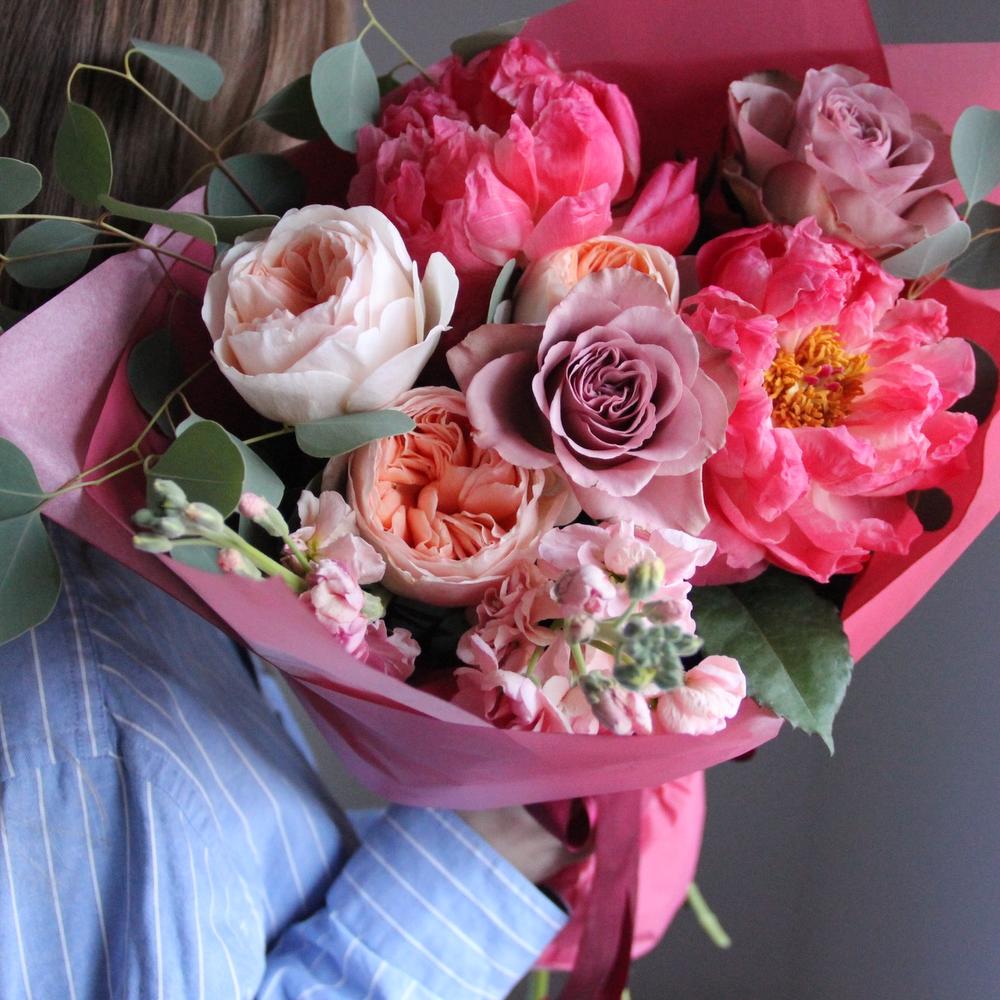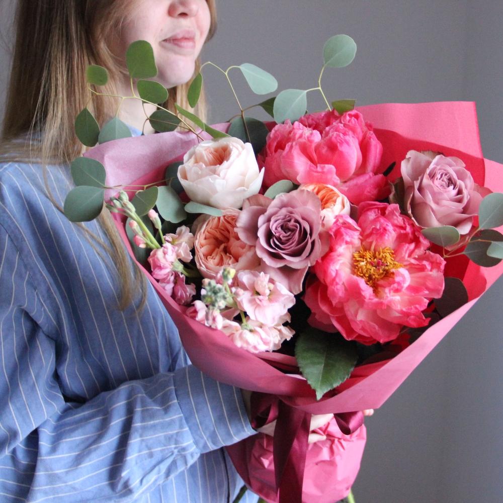 Авторский букет с пионами, маттиолой, пионовидными розами и эвкалиптом.Стильное цветочное решение для любого случая.