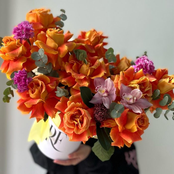 Цветы в большой коробке: садовые розы, лизиантус, маттиола, тюльпаны