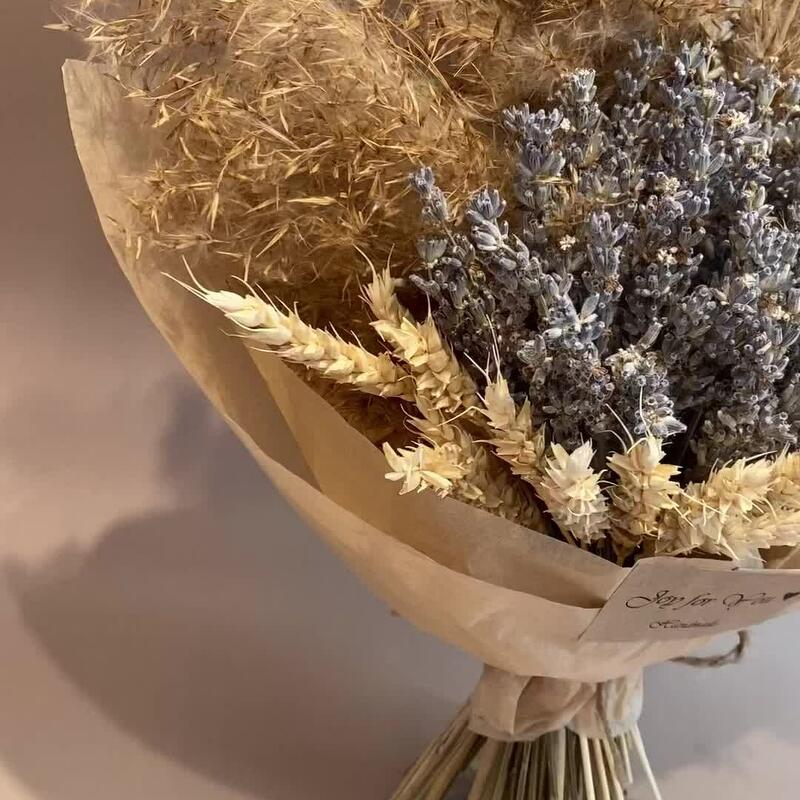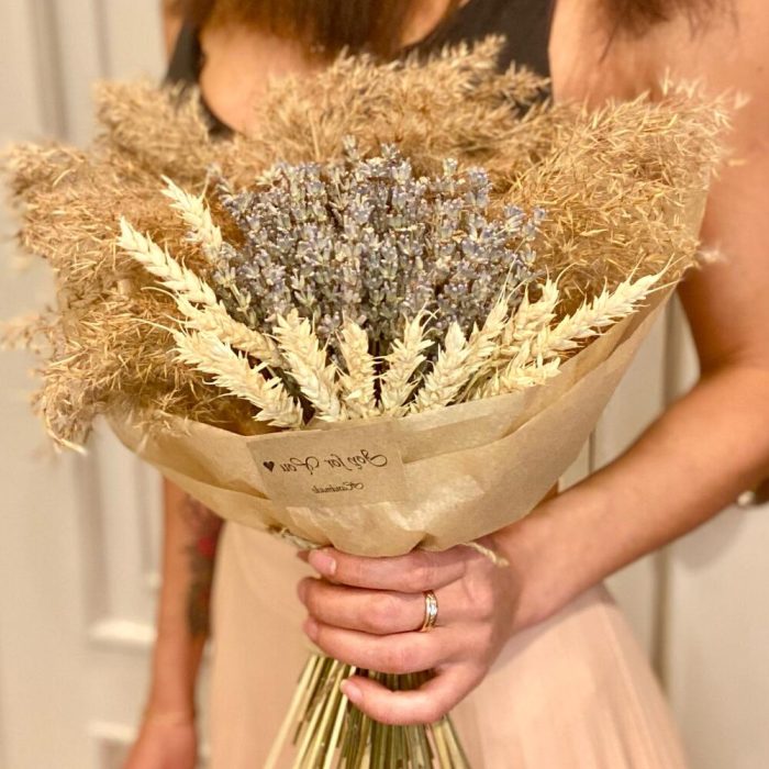 Лаванда (сухоцвет) – 1 шт.Пшеница (сухоцвет) – 15 шт.Дизайнерская упаковка – 1 шт.пампасная трава – 4 шт.