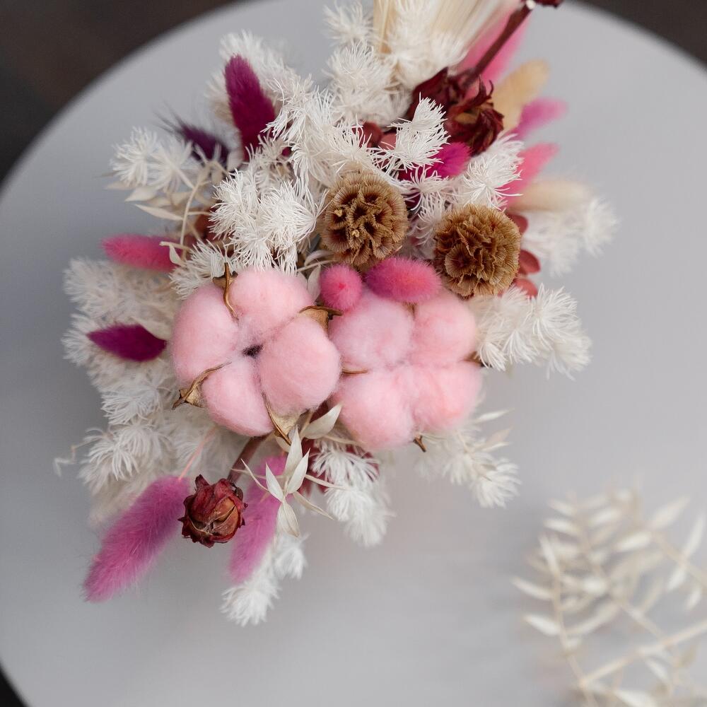 Хлопок натуральный – 2 шт.Скабиоза – 3 шт.Лагурус (сухоцвет) – 15 шт.аспарагус стабилизированный – 4 шт.гортензия стабилизированная – 1 шт.пальма сухоцвет – 1 шт.Кашпо керамическое – 1 шт.