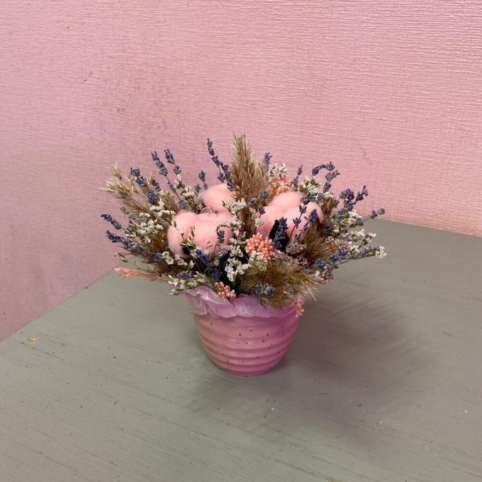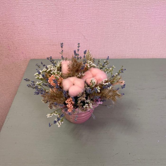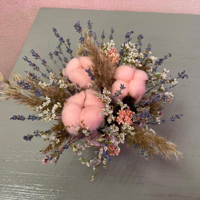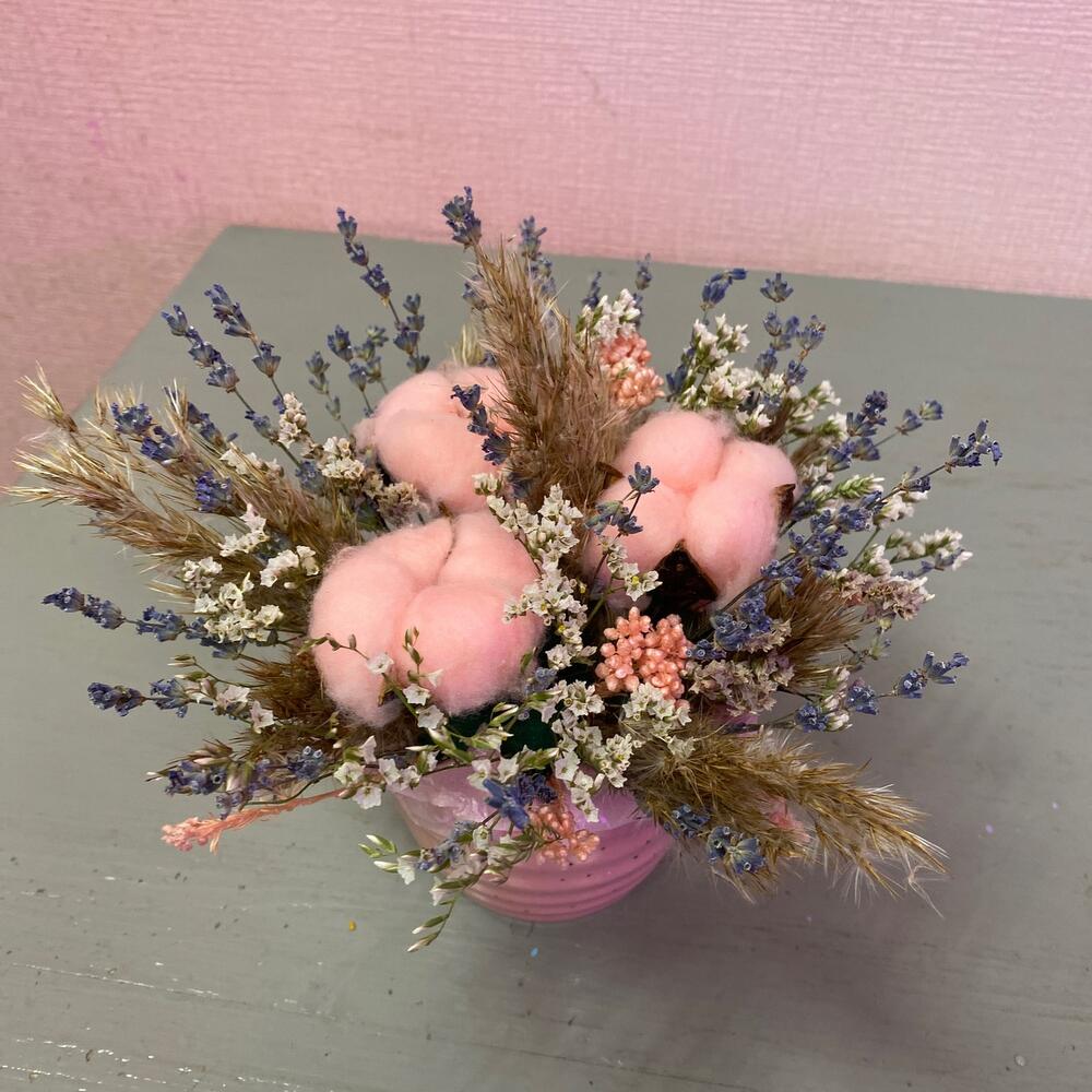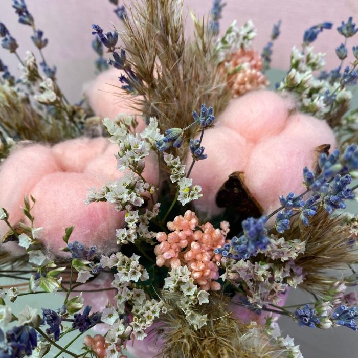 Хлопок натуральный – 3 шт.озотамнус розовый стабилизированный – 1 шт.лимониум стабилизированный – 1 шт.Ковыль – 1 шт.Лаванда (сухоцвет) – 30 шт.Оазис флористический – 1 шт.Кашпо керамическое – 1 шт.