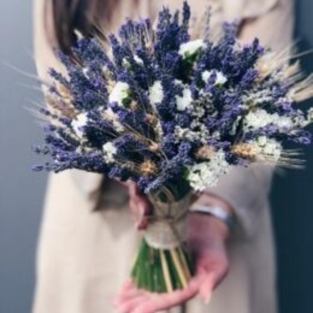 Лаванда (сухоцвет) – 105 шт.пшеница сухоцвет – 15 шт.лимониум сухоцвет – 15 шт.Лента атласная – 1 шт.