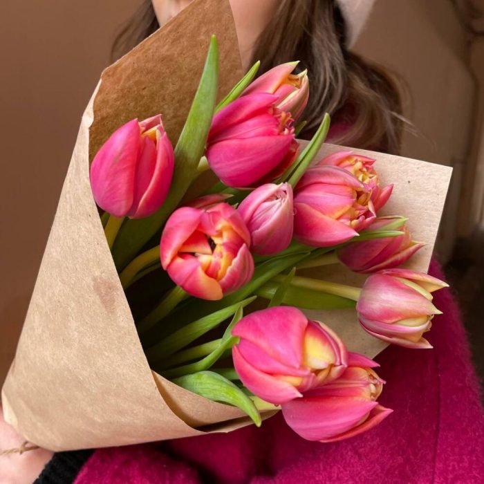 Крафтовая упаковка – 1 шт.Розовый пионовидный тюльпан – 11 шт.