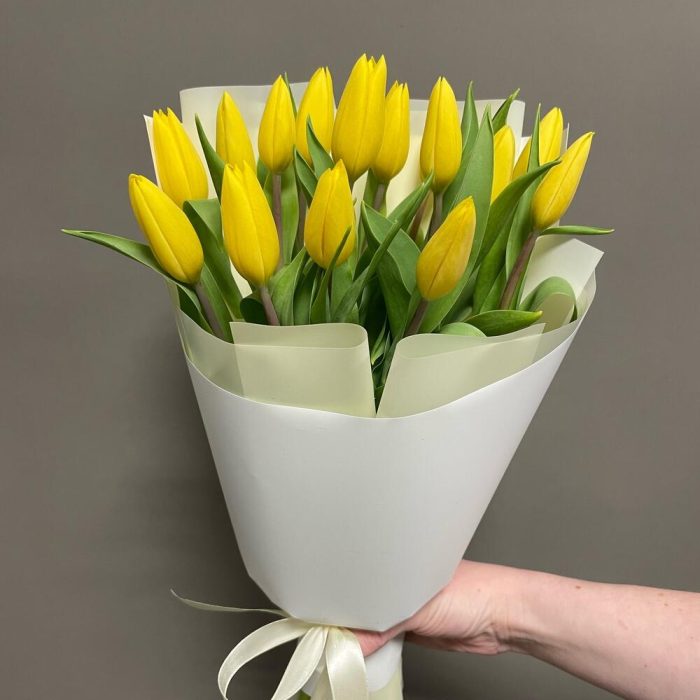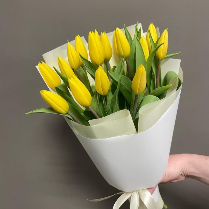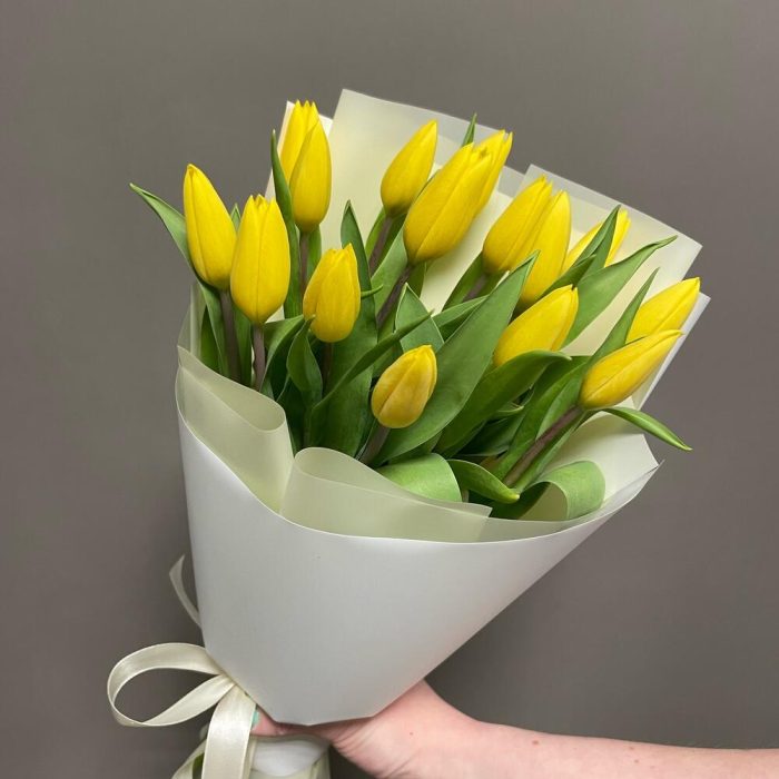 Лента атласная – 1 шт.Упаковка дизайнерская – 1 шт.Желтый тюльпан – 12 шт.