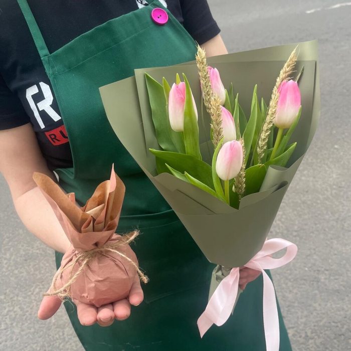 РОЗОВАЯ СВЕЖЕСТЬ оригинальный набор из тюльпанов с пшеницей и ароматным яблоком