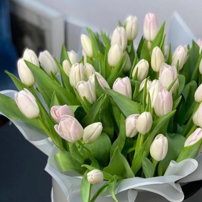 тюльпаны белые – 51 шт.Коробка шляпная – 1 шт.Упаковка дизайнерская – 1 шт.Лента атласная – 1 шт.Открытка – 1 шт.инструкция по уходу за цветами – 1 шт.хорошее настроение – 100 шт.Кризал – 1 шт.